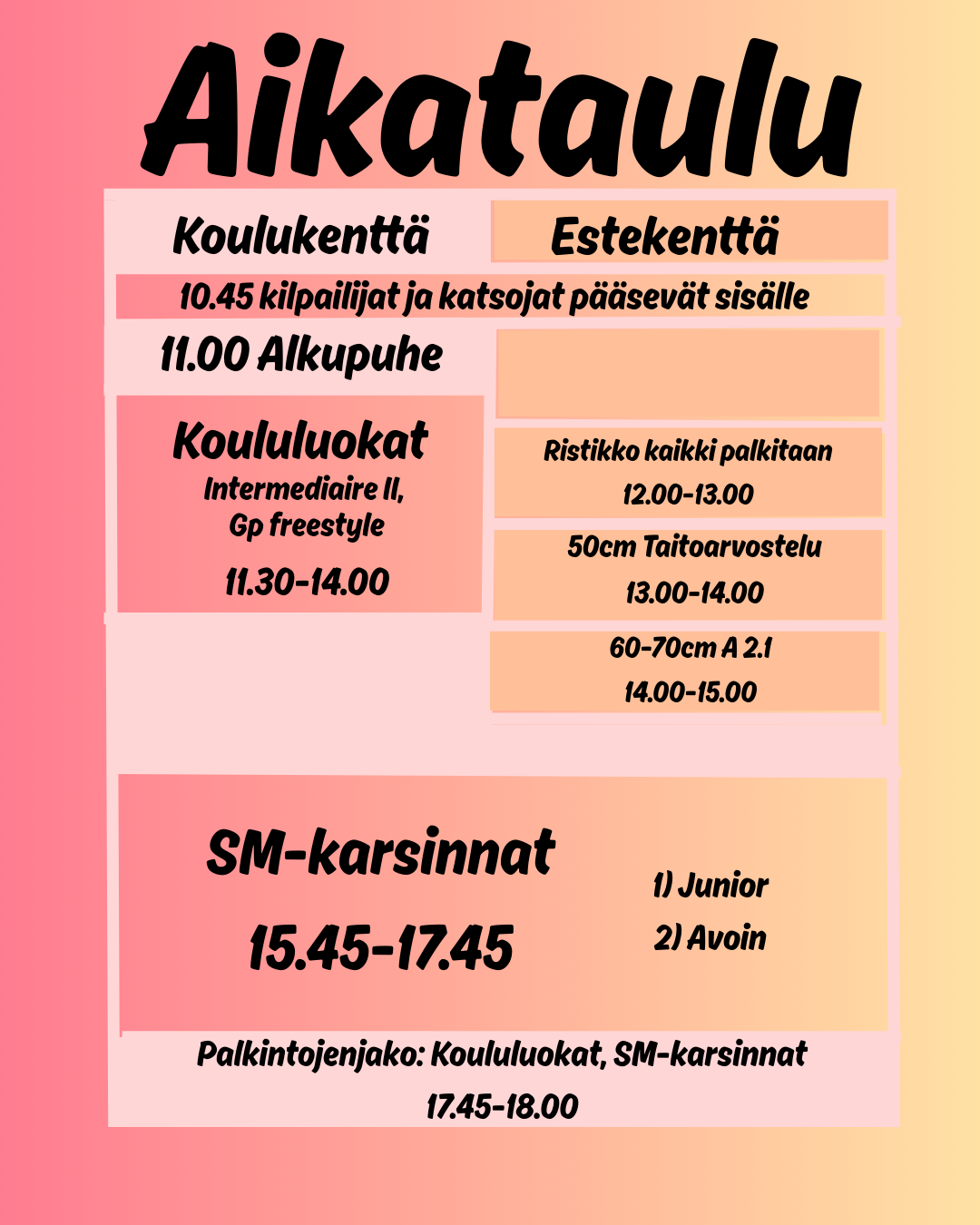 Avoimien esteluokkien palkintojenjaot suoritetaan aina kyseisen luokan jälkeen. Koululuokkien ja karsintojen palkintojenjaot suoritetaan päivän lopuksi. Kilpailut pyritään päättämään klo 18.00 mennessä.